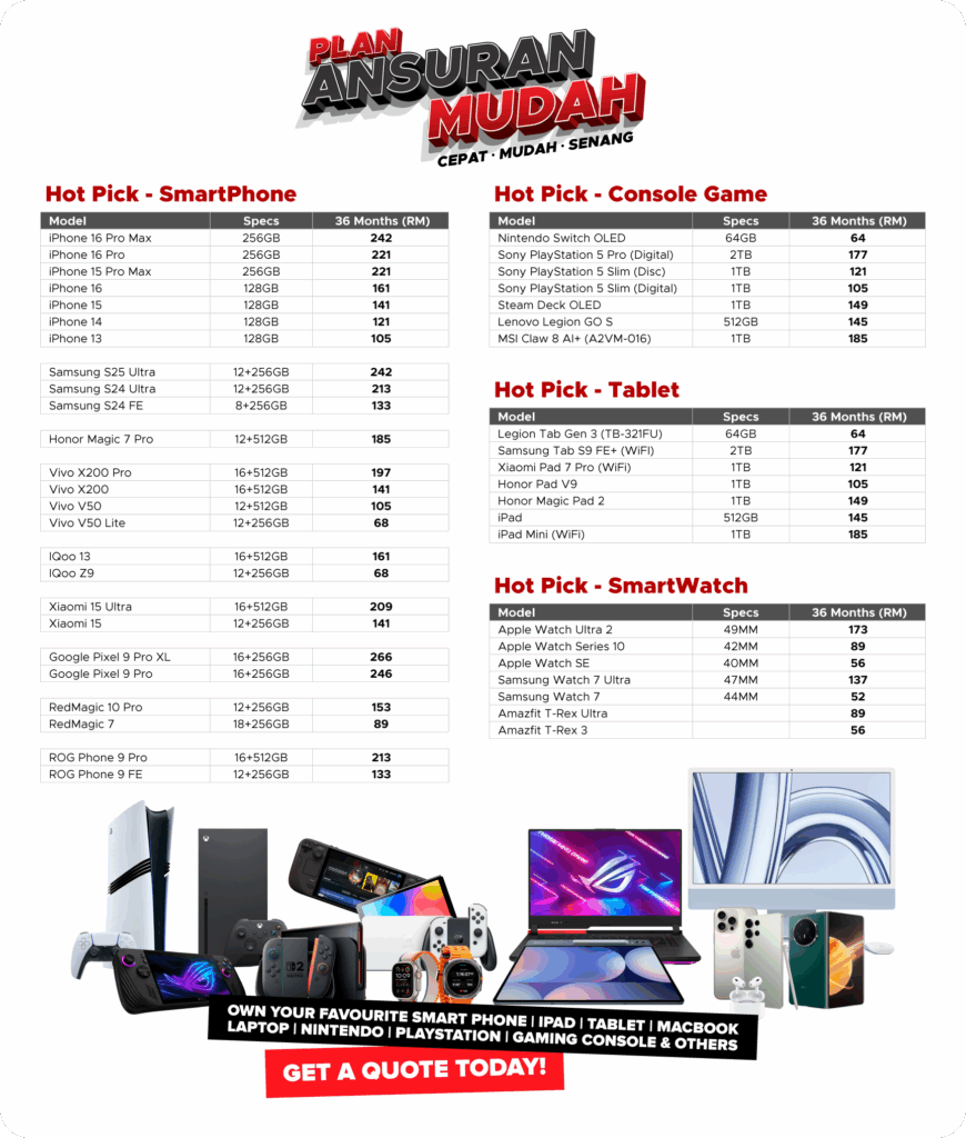 No worries! Now, just with RM40/month, you can own your favourite phone! Easy phone loan, hassle-free process! Apply Today!