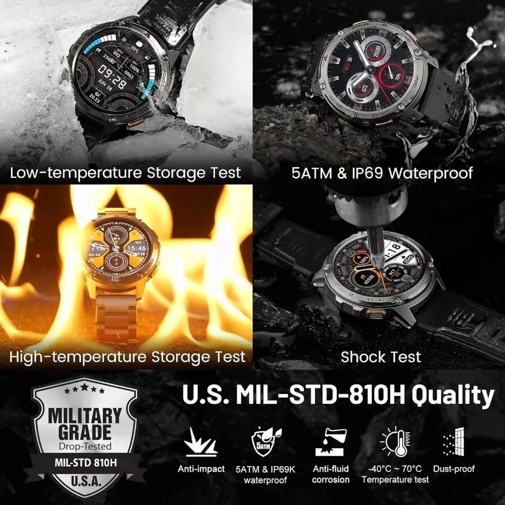 The Kospet Tank T3 is engineered for extreme durability, meeting over 15 US MIL-STD-810H military standards. Designed to withstand extreme temperatures, drops, and chemical corrosion, this rugged smartwatch is built for tough environments.