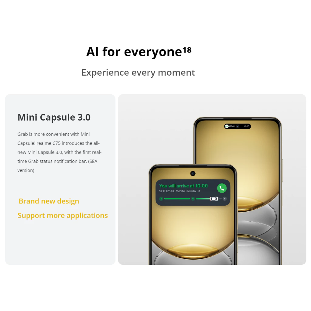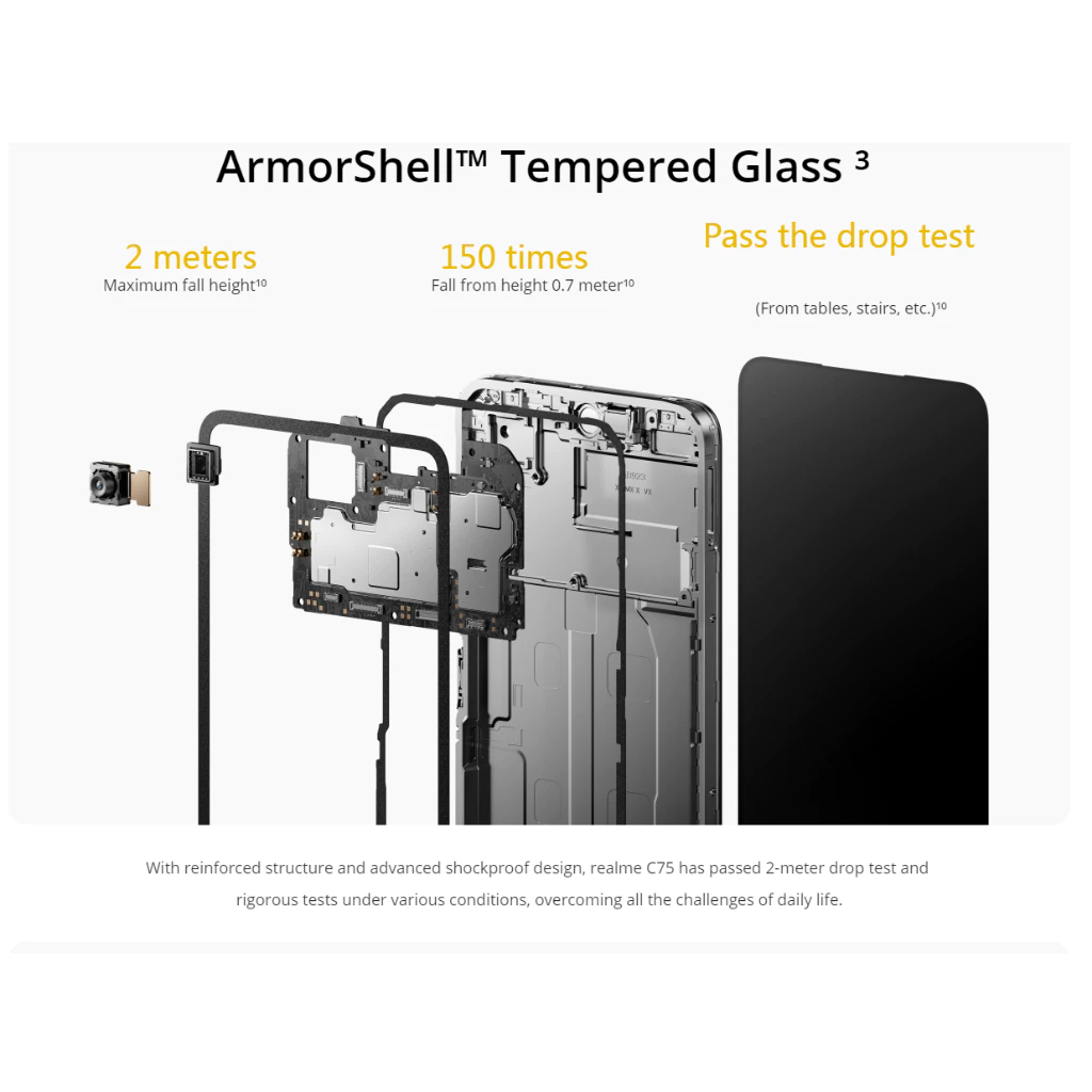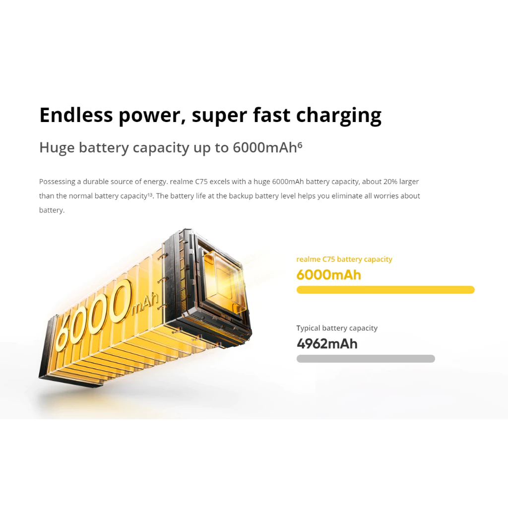 Huge battery capacity up to 6000mAh USB Type-C port *realme C75 battery has a typical value of 6000mAh and a rated capacity of 5860mAh.